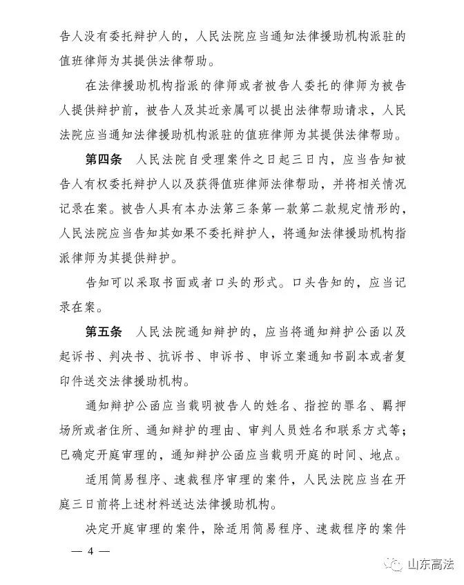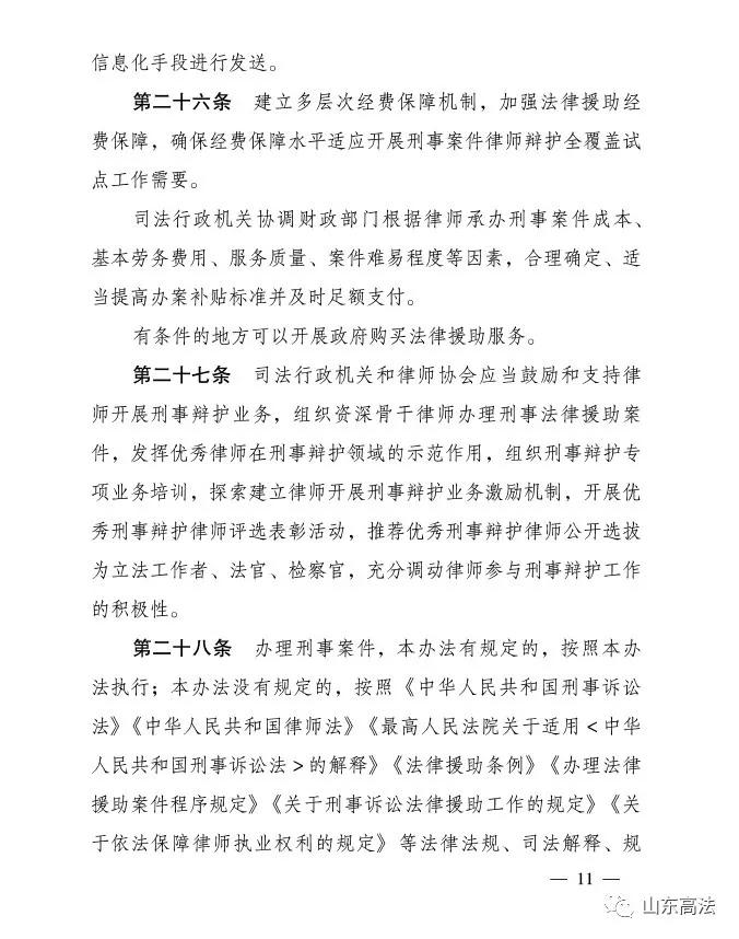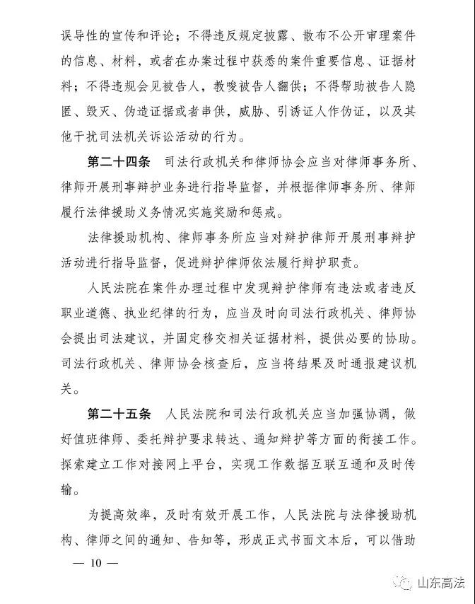 为落实最高人民法院、司法部《关于扩大刑事案件律师辩护全覆盖试点范围的通知》要求,确保今年年底前在全省范围内全面开展试点工作,山东高院与司法厅经过认真研究,结合全省实际,联合印发《关于开展刑事案件律师辩护全覆盖试点工作的实施办法》(以下简称《办法》)。《办法》根据《刑事诉讼法》、《最高人民法院司法部关于开展刑事案件律师辩护全覆盖试点工作的办法》等法律和规范性文件制定,共30条,对适用普通程序审理的一审、二审案件、按照审判监督程序审理的案件,以及适用简易程序、速裁程序、强制医疗程序审理的案件,被告人获得律师辩护和法律帮助的范围、方式,以及辩护律师和法律帮助律师的执业资格、履职要求等,作出了明确规定,为律师充分发挥在刑事案件审判中的辩护作用提供了遵循和保障,有利于在刑事司法领域加强人权司法保障,促进司法公正。